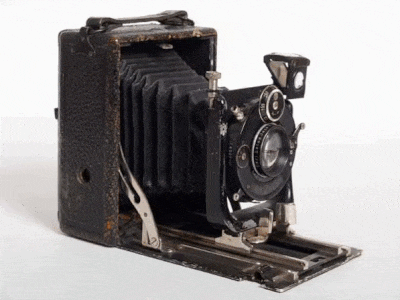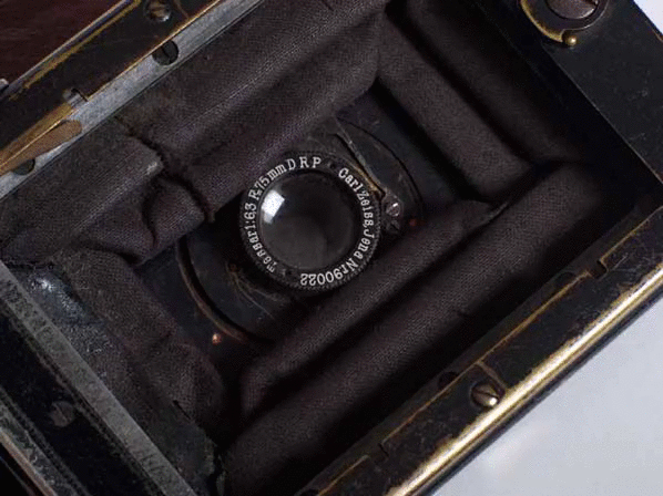 Apparecchio fotografico in metallo ricoperto in pelle nera, del formato 9 x 12 cm per lastre in vetro. Soffietto a doppio tiraggio e doppia cremagliera, fino a cm 19. Decentramento ottico orizzontale e verticale. Otturatore Compur con velocità fino a 1/250". Obiettivo Zeiss Tessar 1:4,5 f=105 mm. Mirino prismatico orientabile orizzontalmente e verticalmente. Dimensioni cm 9,5 x 12 x 5 (chiusa), 16 (aperta). Peso g. 581. Circa 1930.