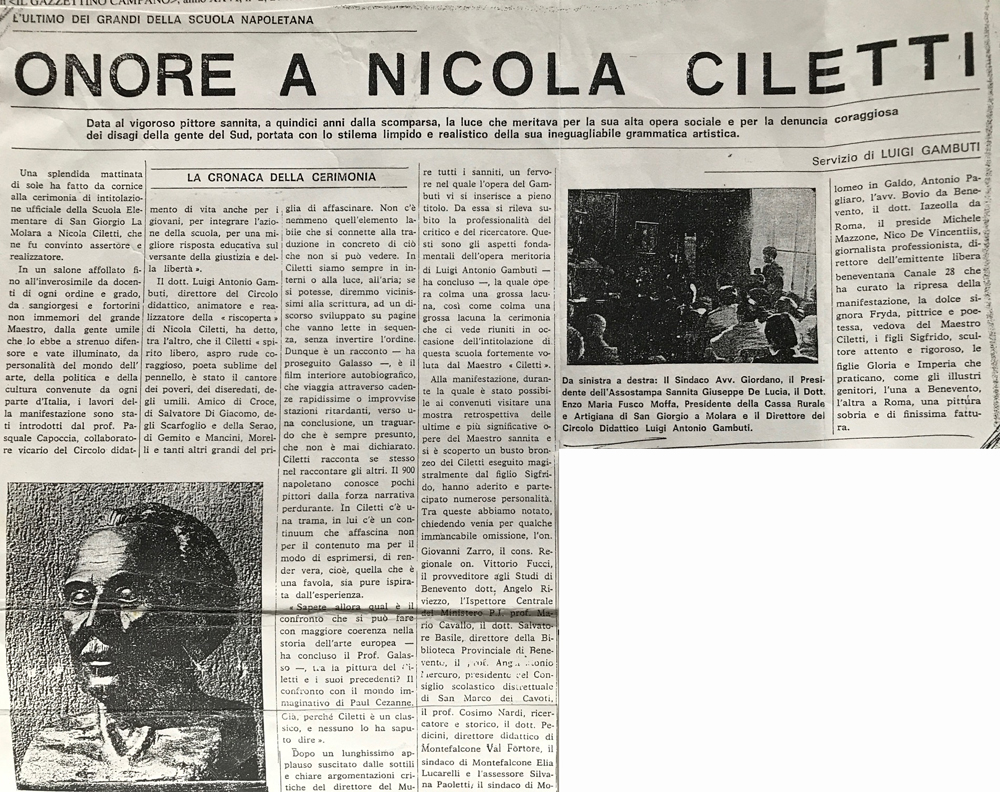 L. Antonio Gambuti si sofferma a delineare il profilo umano dell'artista, Massimiliano Vairo traccia le linee dell'ampio e ancora indefinito orizzonte dell'arte di Nicola Ciletti.