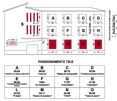 Dettagli del progetto: Le tele consistono in riproduzioni di quadri di Ciletti, riprodotte su telo retro-illuminabile resistente alle intemperie (tipo “back light” traslucido retroilluminabile). Le tele ai livelli 1° e 2° (cioè da “A” a “H”) sono su teli di dimensioni cm. 220x240 (compresi cm. 10 per ogni lato per il risvolto e la spillatura sul telaio in legno). La parte non coperta dall’immagine del quadro, è stampata in nero al fine di realizzare un passpartout al quadro. I telai sono realizzati mediante mezzanelle di legno, e su di essi sono spillati i teli a terra, successivamente sollevati esternamente all’edificio scolastico e fischerati negli imbotti delle finestre operando dall’interno dell’edificio scolastico. I telai sono montati cm. 10 all’interno del filo degli imbotti delle finestre, e a distanza di cm. 20 dai retrostanti infissi vetrati esistenti. Tra tela ed infisso, sono posizionate una serie di luci con lampade al neon (tali non provocare calore che potrebbe danneggiare le tele stesse) al fine di ottenere un’illuminazione omogenea delle tele.